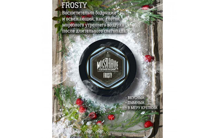 Табак для кальяна Must Have Frosty – превосходный выбор для тех, кто ценит бодрящий эффект утреннего мороза. Он хорошо подходит к фруктам, ягодам, шоколаду и чаю и любому сочетанию ароматов добавит приятную нотку свежести.