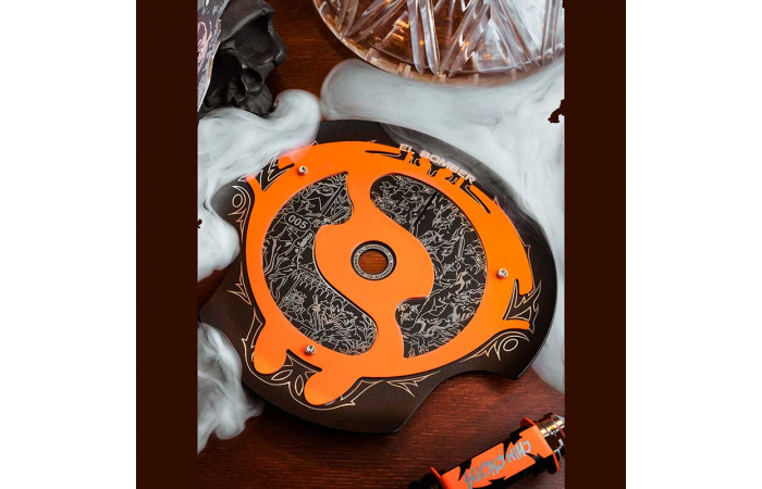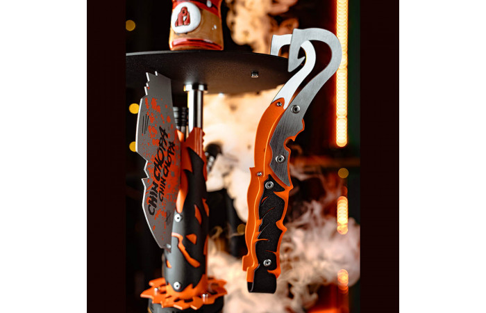 Шахта повторяет оружие героя — топор. На ем нанесен принт с изображением Пуджа, его легендарной фразой и подписью известного кальянного блогера Славы КМТМ — одного из главных игроков кальянной индустрии. Основание шахты дополнено декоративным элементом в виде желанного артефакта в игре.