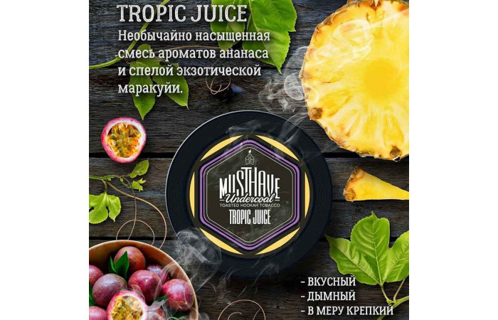 В меру крепкий табак Must Have со вкусом Tropic Juice поднимет настроение всем, кто его попробует.