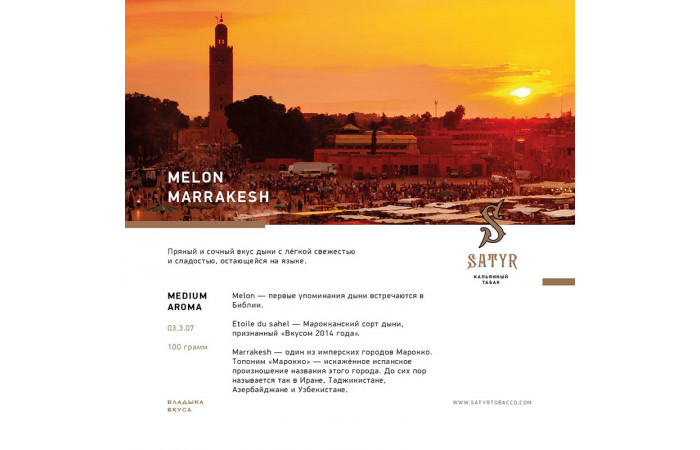 Описание вкуса табака для кальяна Satyr - Melon Marrakesh (Дыня Марракеш) 100г